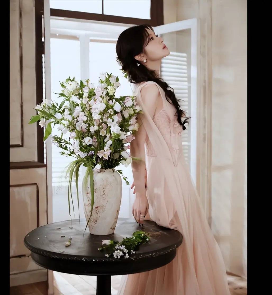 李兰迪倚桌而立,浅粉纱裙与桌上花束相映,温柔优雅,李兰迪倚墙垂眸,宛如春日油画,李兰迪纱裙铺展,慵懒又清新,仙气十足,李兰迪笑容明媚元气满满,李兰迪笑眼弯弯。